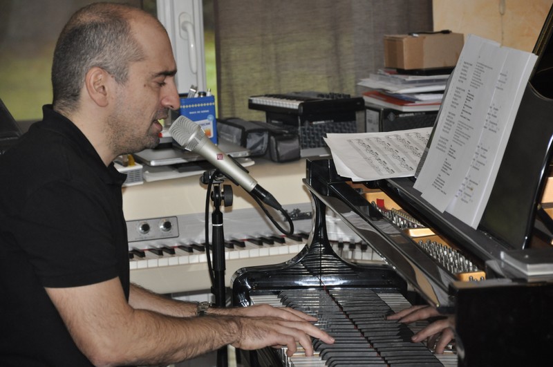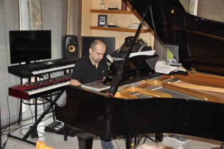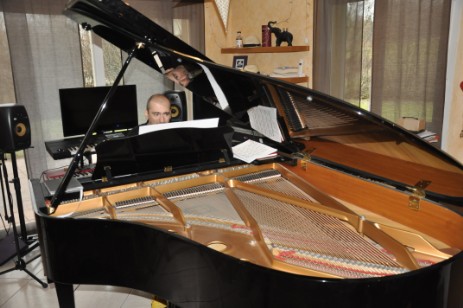 De tous les côtés, Laurent vit de la musique autant qu’il la vit. « C’est pour moi un exutoire, notamment l’écriture » confie-t-il « C’est également une façon de penser la vie, une philosophie de partage spontané ». Et de poursuivre en prenant place au piano : « C’est aussi un moyen de communication universel ». Les premières notes s’envolent, tout en nuances. Des arpèges aussi légers que parfaitement maîtrisés aux sonorités puissantes, les vibrations sortent du demi-queue, pénétrant le corps de tous côtés et le faisant frissonner à profusion, de temps à autre accompagné par un chant là aussi plein de maîtrise. Et la concentration du « pro », mise à l’épreuve par le passage du chiot qui vient de rejoindre la famille avec une guirlande du sapin de Noël qu’il vient de « chiper » dans la gueule, reste profonde, permettant à Laurent de demeurer impassible, imperturbable…