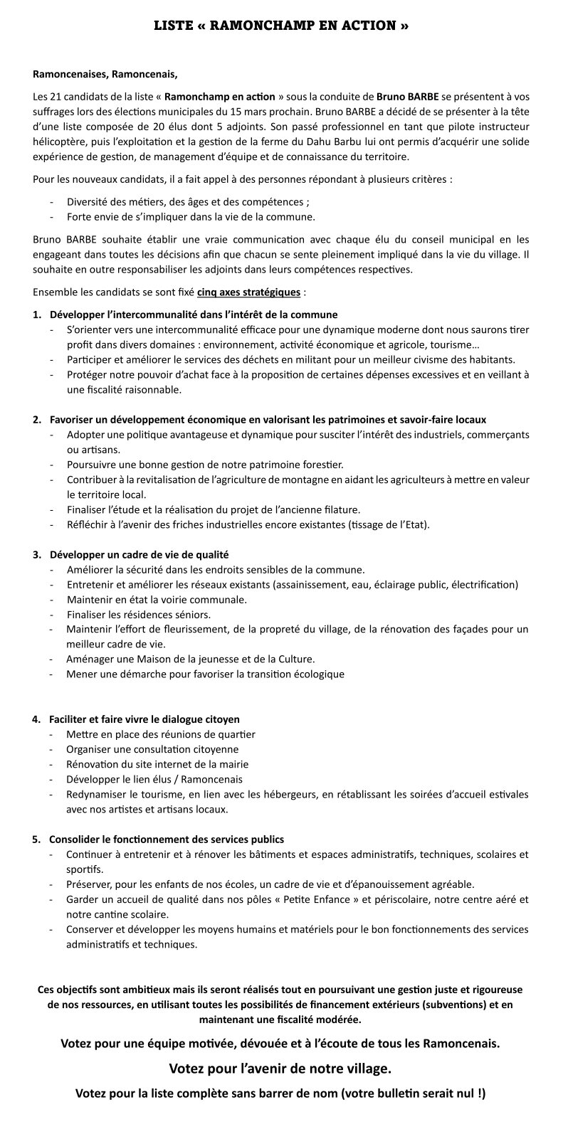La liste "Ramonchamp en action", conduite par Bruno Barbe, tiendra une réunion publique à la salle des fêtes le jeudi 12 février à 20 heures.