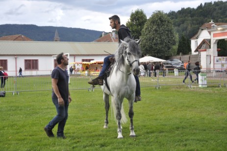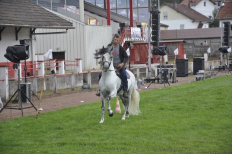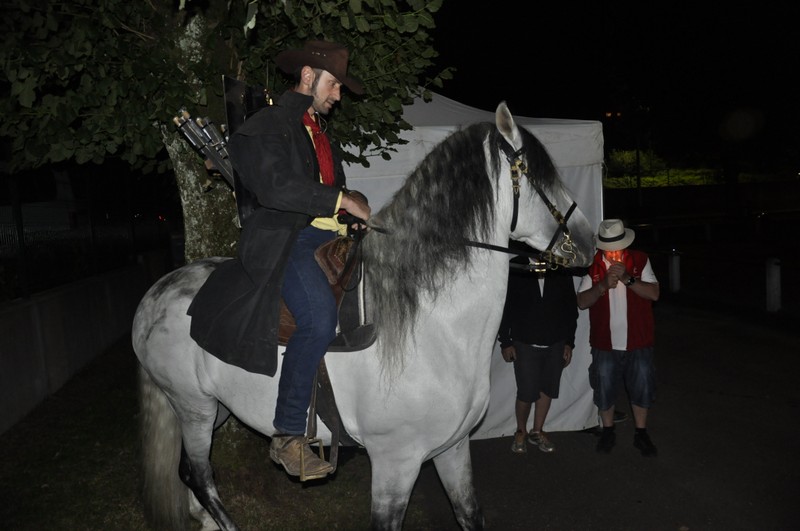 La musique se tait… puis redémarre. Un cheval blanc, monté par un cavalier au « look » de cow-boy mystérieux s’élance au galop sur la piste.