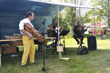 guitare, Jean-Claude au violon et Mickaël et son drôle d’instrument
