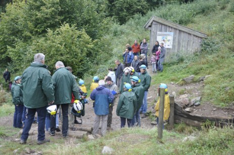 A la sortie de la galerie, les visiteurs peuvent apercevoir un amas de pierre qui, après reconstitution, évoque un support ayant servi au système complexe d’extraction d’eau des galeries, permettant le transfert du mouvement initié par une roue mue par l’eau vers des pompes installées dans le réseau minier.