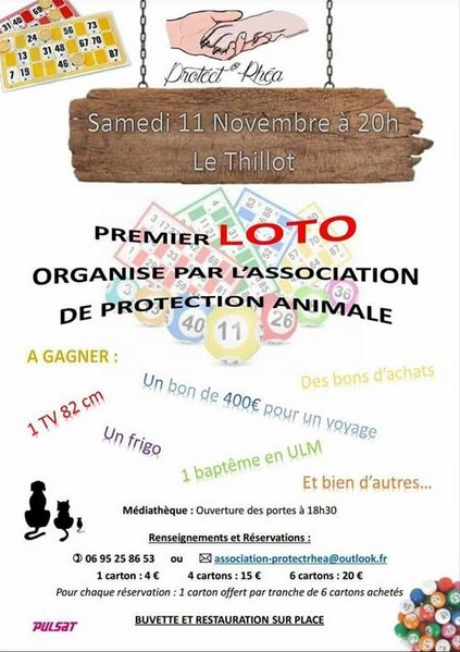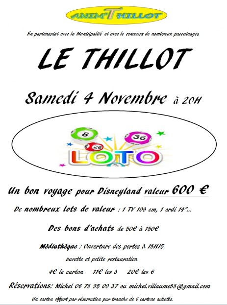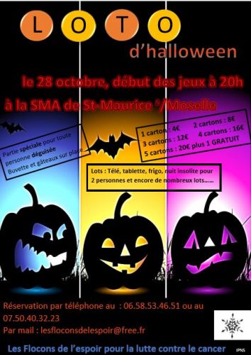 Loto d’Halloween proposé par l’association « Les Flocons de l’Espoir » le samedi 28 octobre à partir de 20h à la salle multi-activités de St Maurice, loto du Hand-Ball Club le dimanche 29 octobre à 20h à la salle des fêtes de Ramonchamp, loto de l’association Anim’Thillot le samedi 4 novembre à 20h à la médiathèque, loto de l'association Protect'Rhéa le samedi 11 novembre à 20h00 à la médiathèque : les adeptes du loto vont avoir de quoi assouvir leur passion…