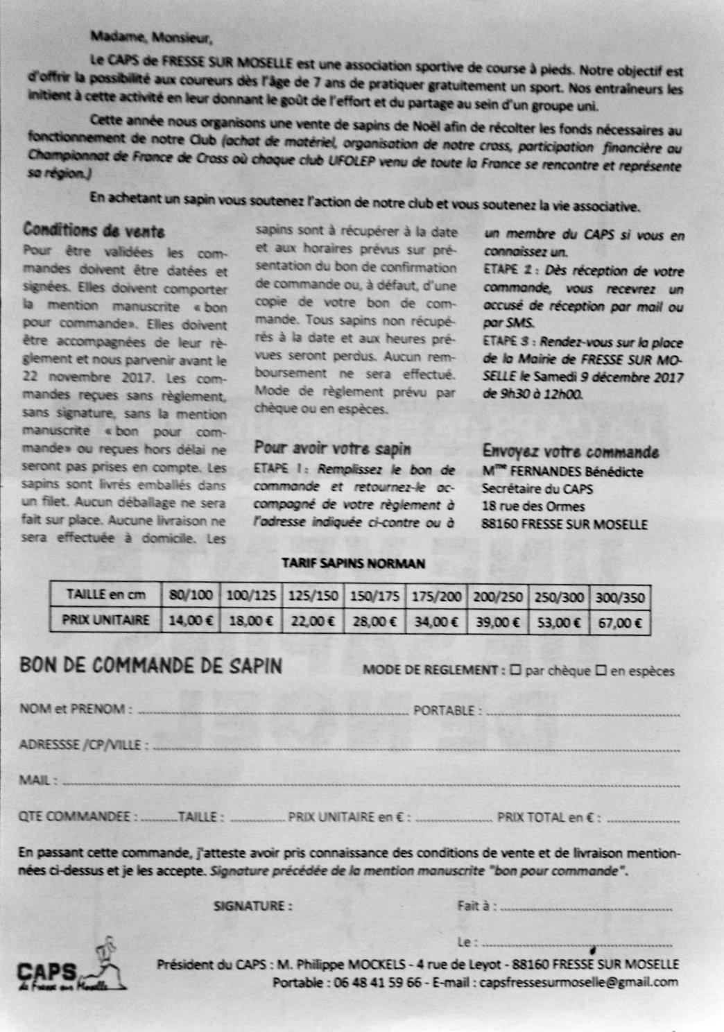 Le coup d’envoi de la fête patronale a été donné ce samedi avec l’inauguration officielle. En la circonstance, et après son petit mot d’accueil, précisant notamment les raisons du déplacement du manège enfants pour cause de mise aux normes des escaliers permettant l’accès à la mairie, Laurence Botton, maire-adjointe a laissé à sa collègue du conseil Bernadette Jacquot le soin de couper le ruban inaugural. Une fête patronale à laquelle la commune souhaite depuis quelques années déjà donner un lustre particulier. C’est ainsi que les enfants ont pu passer par l’atelier maquillage où, sous les doigts d’une animatrice pleine de patience et de talent, en ressortir avec le plein de couleurs et de paillettes. A l’extérieur, un stand bien garni de gâteaux offerts par l’association des Bretons des Vosges attendait les visiteurs atteints de petites fringales, tandis que chocolat et vin chauds étaient proposés par la CAPS pour celles et ceux qui souhaitent se réchauffer en cette période quelque peu frisquette. Dès cette courte cérémonie terminée, les premières notes de musique d’ambiance pouvaient envahir la place, donnant du même coup le signal de départ des premières rotations des manèges pour le plus grand plaisir des bambins. A noter que le CAPS présidé par Philippe Mockels, proposera une vente de sapins de Noël avec l’objectif affiché de récolter des fonds pour le fonctionnement du club de course à pieds. Les commandes peuvent d’ores et déjà être passées et payées auprès de la secrétaire du club : Bénédicte Fernandes par courrier postal au 18 rue des Ormes à Fresse ou par email à capsfressesurmoselle@gmail.com au plus tard pour le 22 novembre. Les tarifs sont les suivants : 80/100cm à 14 Euros, 100/125 cm à 18 Euros, 125/160 cm à 18 Euros, 125/150 cm à 22 Euros, 150/175 cm à 28 Euros, 175/200 cm à 34 Euros, 200/250 cm à 39 Euros, 250/300 cm à 53 Euros et 300/350 cm à 67 Euros. Les sapins pourront être récupérés le samedi 9 décembre prochain de 9h30 à 12h place de la Mairie. Vous pouvez télécharger le bon de commande en cliquant ici.