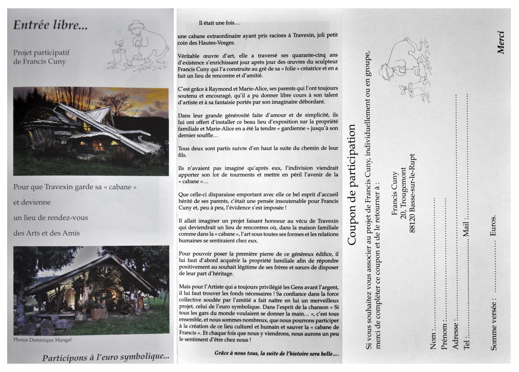 En premier lieu, une souscription a été ouverte sur la base d’une participation de 1 Euro par personne. Contribution qui peut bien évidemment aller au-delà de cet Euro symbolique. Les premiers chèques sont d’ailleurs arrivés qui passent outre cette somme infime. L’objectif est bien évidemment de permettre à Francis Cuny d’acquérir la maison familiale, pouvoir reverser leur part à ses frères et sœurs et ainsi préserver l’atelier de la disparition. L’artiste sculpteur compte donc sur la mobilisation de ses amis afin qu’ils participent activement à cette opération à hauteur de leurs moyens et surtout que cette démarche soit relayée autant que possible avec, à la clé, un effet boule de neige qui devrait permettre à Francis de constituer les fonds nécessaires à l’acquisition de la propriété.Vous pouvez télécharger le flyer avec le coupon de souscription édité à cette occasion en cliquant ici.
