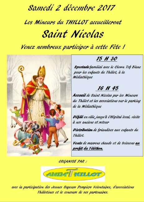 Samedi 2 : - à partir de 15h45 à la Médiathèque : spectacle et défilé de St Nicolas (Anim’Thillot) - à 20h30 à la Médiathèque : spectacle Radio des Ballons avec Dominique Walter et Bruno Grossier (réservations au 06 08 03 64 13)