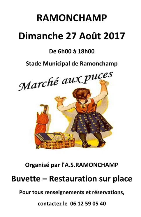 Dimanche 27 août, dès 6h00 et jusque 18h00, le stade municipal de Ramonchamp accueillera le marché aux puces de l'ASR. Buvette et restauration seront disponibles sur place. Renseignements et inscriptions au 06 12 59 05 40.