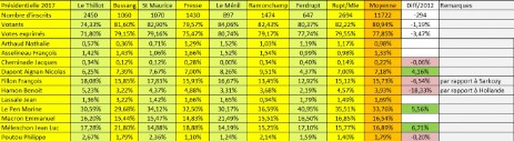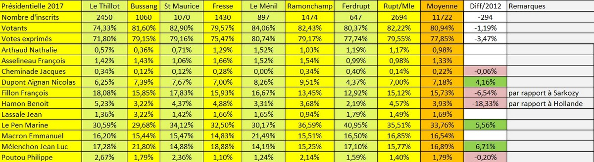 Le détail des résultats du 1er tour de l’élection présidentielle dans les 8 communes historiques du canton montre que le canton a voté de façon sensiblement identique qu’en 2012, avec une perte de votants de 1.19% pour s’établir à 80.94%. Déjà à midi, le taux de participation flirtait avec les 50% dans plusieurs communes. Dans la vallée de la Haute Moselle, les électeurs ont, dans un premier temps, suivi le vote national en plaçant Marine Le Pen en tête avec un score de 33.76%, soit 9.86% de plus que la moyenne nationale, et un gain de suffrages de 5.56% sur le canton par rapport à 2012. Des électeurs qui sont restés visiblement peu sensibles aux bruits des casseroles trainées par la candidate du Front National. Derrière le canton se distingue, plaçant Jean-Luc Mélenchon en seconde position. Le candidat de « La France Insoumise » totalise 16.89% des bulletins, enregistrant la plus forte progression avec 6.71%, cependant insuffisant au niveau national pour le porter vers le 2ème tour. Avec 16.54% des votes, Emmanuel Macron arrive en 3ème position, suivi par François Fillon qui, avec 15.73% se « ramasse une grosse gamelle », perdant 6.54 points par rapport au score de Nicolas Sarkozy en 2012, selon toutes vraisemblances en relation avec les « nombreuses et bruyantes casseroles », affaires auxquelles il est présumé mêlé, et que les électeurs ont, dans ce cas, pris en considération. Mais la plus grosse « gamelle » est celle de Benoit Hamon qui, avec ses 3.93% enregistrés sur les 8 communes, perd 18.33% par rapport au score de François Hollande en 2012, payant ainsi au prix fort les trahisons multiples des membres du PS, et probablement la politique très contestée menée par François Hollande durant son mandat.