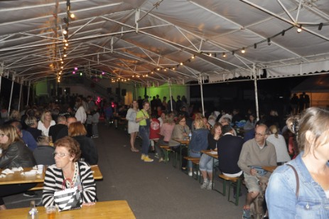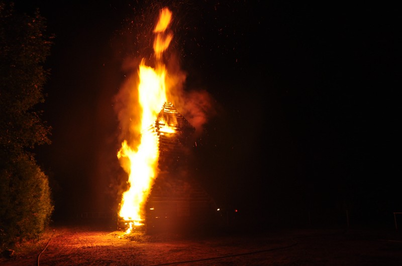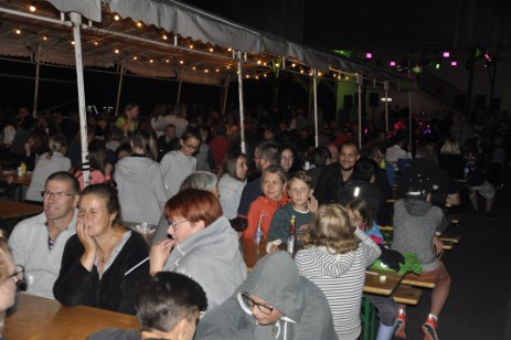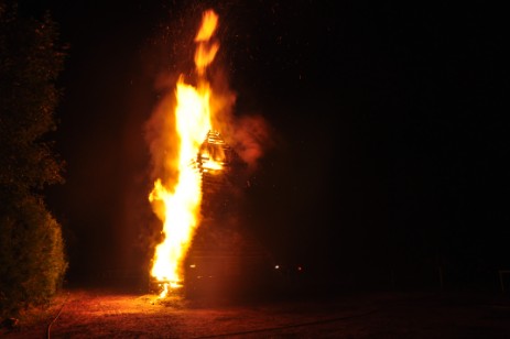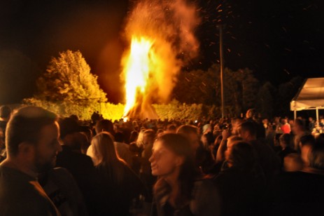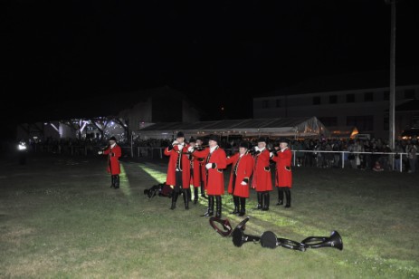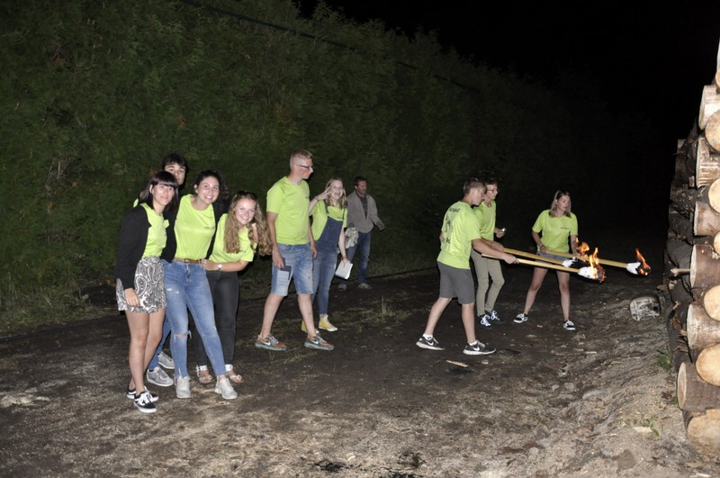 La réputation de la soirée du feu de St Jean au Ménil n’est pas usurpée : jeudi soir, c’est une foule dense et enthousiaste qui a répondu à l’invitation des jeunes de la classe 2019. Une belle récompense pour la troupe présidée par Julien qui n’a pas ménagé ses efforts pendant 2 mois pour monter cette chavande. Seule note triste de la soirée « Quel dommage qu’Hugo ne soit pas avec nous ce soir.. » regrettait la bande de potes en ayant cette pensée pour celui qui a participé à cet ouvrage, mais qui n’a pu être présent, la faute à une hospitalisation après un accident de foot… Pour le reste, la soirée n’a été que joie et bonne humeur. Rassemblé très tôt dans la soirée, le public a pu fréquenter à loisir les stands buvette et repas où les parents des jeunes de la classe étaient « au taf », avant de s’installer sous le chapiteau pour des moments de pure convivialité, pendant que d’autres s’éclataient déjà sous le préau de la Familiale aux allures de boite de nuit avec sono et jeux de lumières impressionnants. Dès la nuit tombée, le groupe des trompes de chasse offrait sa superbe aubade au public, avant que les lumières s’éteignent pour faire place au feu d’artifice.