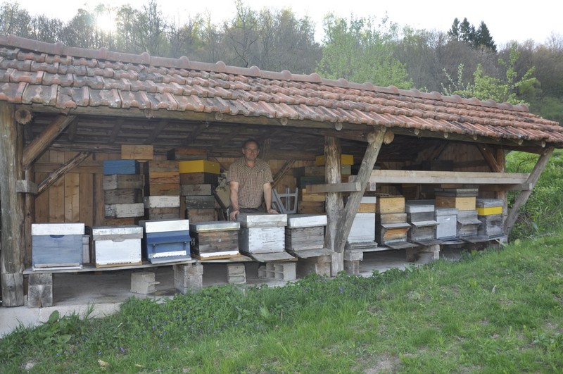 « Déjà tout môme, j’étais attiré par les abeilles. Je me souviens que l’instituteur de mon village en Moselle avait des ruches. Mais lorsque je m’approchais, il me renvoyait sévèrement ». Loin d’être découragé, Philippe Mockels a conservé cette attirance au fil du temps, la rangeant dans un coin de sa tête pour mieux la ressortir le moment venu. Un nouvel épisode intervient vers l’âge de 25 ans. Il remarque un essaim égaré dans le jardin de ses parents. Il se met à la recherche d’une personne ayant le savoir-faire pour le récupérer, mais devra se résigner : le temps qu’il trouve, l’essaim est parti… Après s’être installé dans une ancienne ferme à Fresse sur Moselle, il décide de se lancer. « Là encore, cela n’a pas été simple » explique-t-il en souriant « Il a fallu que j’insiste énormément avant de pouvoir rencontrer un apiculteur chevronné ». Mais cette rencontre, survenue il y a une dizaine d’année, quel souvenir ! « Ce « papy » apiculteur était en train de travailler sur les ruches. Il m’a dit de venir l’aider. Je me suis donc pour la première fois retrouvé à manipuler des cadres au milieu d’abeilles tourbillonnantes qui m’ont couvert le corps. J’ai dû faire de gros efforts pour ne pas céder à l’appréhension qui me gagnait, mais au bout d’une demi-heure, mon maître du jour a pu mesurer ma motivation et valider mon envie d’en savoir plus ».