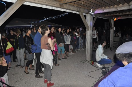 Massé devant la scène ou installé sous chapiteau où des guirlandes multicolores