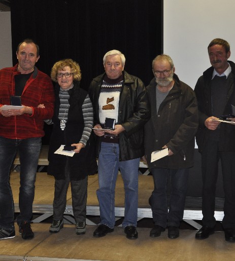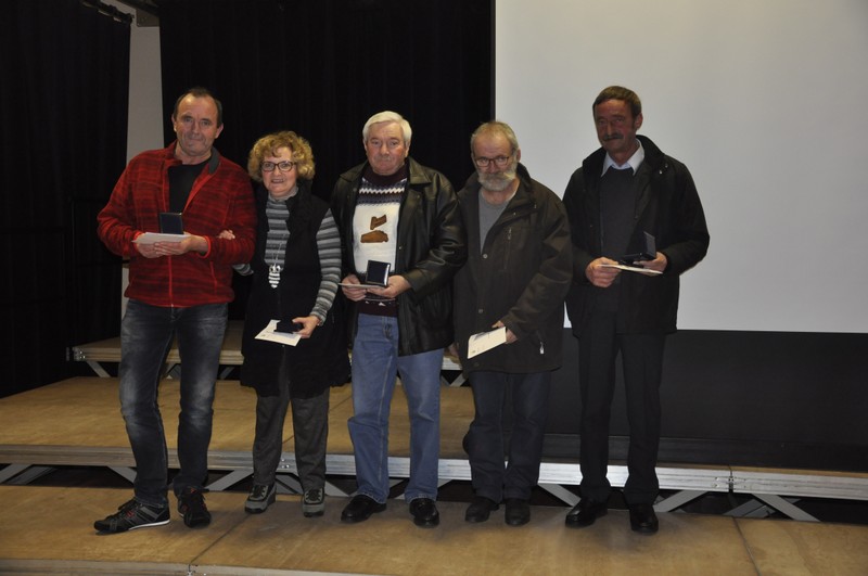 Les médaillés du jour Armelle Hoffmann, gestionnaire de paye du 8 septembre 2008 au 31 octobre 2016 Michel Creusot, agent polyvalent des services techniques du 1er novembre 2009 au 30 avril 2016 Jean-Marie Bazille peintre et agent des services techniques du 1er juillet 1990 au 31 décembre 2016. Pascal Lambolez responsable des services techniques du 1er août 1988 au 30 novembre 2016 Claude Joannes fontainier et agent des services techniques du 1er janvier 1984 au 31 mars 2016 Chacun a reçu sa médaille (bronze pour les 2 premiers, argent pour les 2 suivants et or pour le dernier) des mains de Catherine Louis et Dominique Peduzzi, ainsi que les félicitations et commentaires élogieux teintés d’humour de Michel Mourot.
