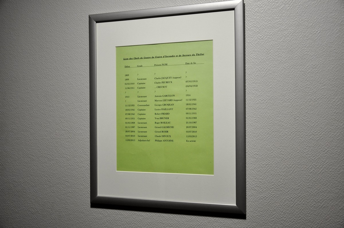 C’est ainsi que les recherches menées par Jean-Philippe François ont permis de retracer la quasi-totalité des commandements (et bien d’autres informations) depuis la création du centre de secours. Une création que le chef de centre souhaite célébrer l’an prochain à l’occasion du 150ème anniversaire. Ailleurs, des photos des sapeurs-pompiers de diverses époques garnissent les murs, dont la plus ancienne est datée de 1888. Un peu plus loin, un autre cadre trône avec fierté, rappelant « l’héroïsme et le sang-froid au cours de la lutte contre les incendies durant les hostilités », une citation remise au corps thillotin, datée du 30 août 1947.