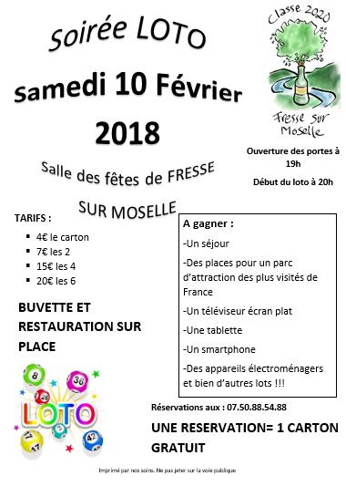 Samedi 10 février Loto à la salle des fêtes de Fresse sur Moselle proposé par la classe 2020. Ouverture des portes à 19h pour début des jeux à 20h. Réservations au 07 50 88 54 88, donnant droit à un carton gratuit. Tarifs : 4 Euros le carton, 7 Euros les 2, 15 Euros les 4, 20 Euros les 6. Nombreux lots à gagner dont un séjour, des places en parc d’attraction, une TV, une tablette, un smartphone, des appareils électroménagers.