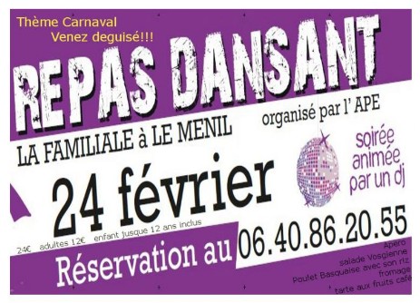 Samedi 24 février Repas dansant : Le Ménil à la Familiale repas dansant de l'Association des parents d'élèves. Un repas placé sous le signe du Carnaval puisque les participants peuvent venir déguisés. L'ambiance sera garantie par la présence d'un DJ ! Tarif : 24 € / adulte, 12 € par enfant de moins de 12 ans. Réservations/renseignements au 06.40.86.20.55 Menu : Apéro, salade Vosgienne, Poulet basquaise avec son riz, Fromage, Tarte aux fruits et café. A noter que cette animation, comme toutes celles que fait l'APE, permet d'accompagner les classes dans leurs projets scolaires.