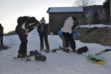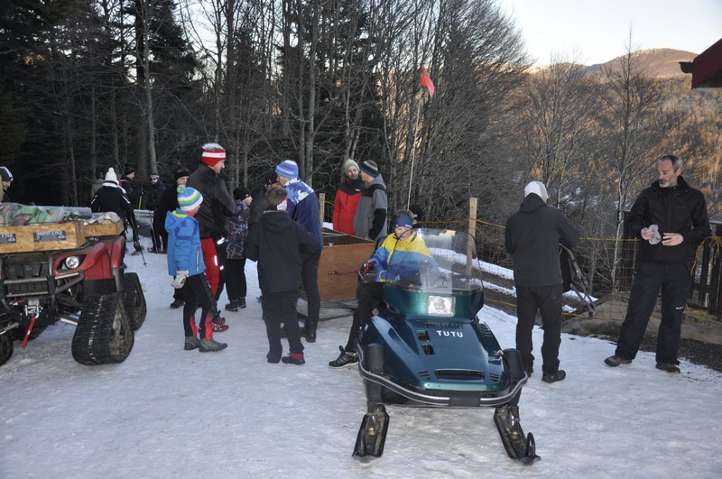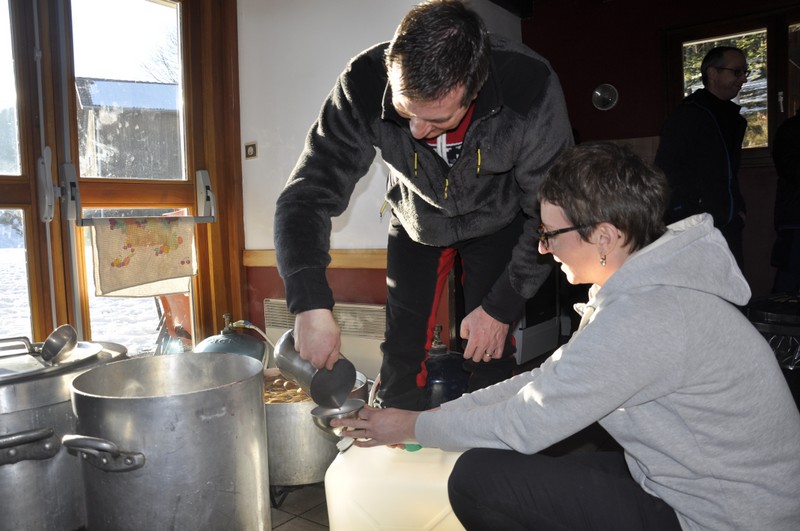 « Ce doit être au moins la 15ème ! » Gérard Remy se gratte la tête en signe d’interrogation pour tenter de se souvenir du nombre d’éditions de la Randonnée Raquette proposées par le « Haute Moselle Ski Nordique » qu’il préside depuis 3 années maintenant à la suite de son frère Michel. « Il s’agit d’une animation qui conjugue opération d’autofinancement et pratique en lien avec l’activité de l’association » confie Arnaud Henocq en « pleine bourre » à la préparation des repas. Une animation qui se veut également conviviale, témoin l’activité intense qui règne du côté de la cuisine du chalet Luc Colin, sur les hauteurs de Bussang, où est donné le rendez-vous. D’énormes marmites sont disposées sur des trépieds permettant de préparer les 25 kg de pommes de terre, la cinquantaine de saucisses fumées et quelques 80 litres de vin chaud, dont les effluves se répandent sympathiquement dans le chalet souhaitant ainsi la bienvenue aux amateurs de raquettes arrivant sur place. Un breuvage qui est finalement transvasé dans des jerricans afin d’approvisionner la pause que les randonneurs vont marquer sur leur parcours au chalet de Forgoutte, les enfants ayant droit de leur côté à un jus de pomme, chaud également. En même temps que le premier groupe prend le départ sous la conduite du président pour une boucle adaptée d’une heure à une heure et demie, deux engins arrivent également, chargés d’acheminer le vin chaud et le bois permettant de chauffer le chalet étape.