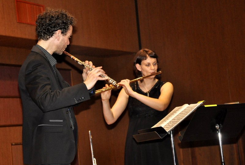 Un « cador » de la flûte, un maître concertiste au statut internationalement reconnu, un musicien-pédagogue apprécié tout autour de la planète (pour en savoir plus, voir : https://www.gasparhoyos.com) offrant son spectacle au public sur la scène d’une petite salle de vallée vosgienne : anachronique ? Quelle motivation a bien pu pousser Gaspar Hoyos à accepter l’invitation de Marie Balland à se produire en ces terres rurales ? La réponse est limpide, empreinte d’une humilité aussi magnifique que la prestation qu’il a offerte aux jeunes musiciens du Grand Ensemble de Flûtes et au public présent samedi soir à la salle polyvalente de Saulxures sur Moselotte : « J’ai besoin de ce genre de rencontre » expliquait-t-il avec simplicité « Cela me permet de recharger mes batteries, de refaire le plein d’énergie ». Disponible, sensible, totalement imprégné de son instrument avec lequel il se fond dans une osmose parfaite, Gaspar Hoyos a proposé au public une démonstration de virtuosité. Des sons d’une pureté absolue, des nuances d’une immense sensibilité qui ont pénétré les spectateurs au plus profond d’eux-mêmes. Seul « En hommage à Jean-Pierre Rampal » ou en duo avec Marie Balland, on sentait qu’il était prêt à danser, à s’envoler. Associant quelques commentaires aux pièces de son programme du jour, Gaspar Hoyos ne se privait pas de plus de feuilleter quelques pages de l’histoire de la musique évoquant notamment la richesse des compositions pour flûte durant la période baroque et au XXème siècle avec Debussy, mais pas grand-chose entre les deux... Période laquelle il sortait tout de même de l’anonymat le compositeur lorrain Joseph Bodin de Boismortier.