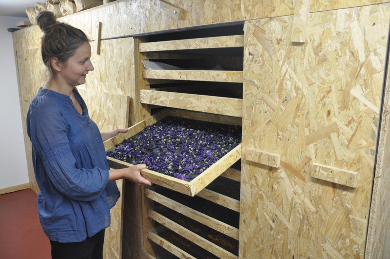 Plus surprenant, une rangée de culture est consacrée à l’edelweiss. « Les conditions climatiques à 1000m dans les Vosges sont équivalentes à celles rencontrées dans les Alpes à 2000-2500 m » confie Gabrielle. Une plante de haute montagne qui, comme les autres fleurs, nécessite une cueillette au quotidien « Nous adoptons les principes de biodynamie, c’est-à-dire que nous respectons le rythme des plantes, que ce soit au niveau de l’ensoleillement ou le calendrier lunaire » détaille William. Des heures de cueillette auxquelles s’associe volontiers leur fille : « J’aime bien cueillir les roses et les bleuets, mais pas du tout les escholtzia qui sentent le poisson » confie-t-elle en se marrant. « Nous traitons de petits volumes de plantes » détaille Gabrielle dans la pièce où est installé le séchoir permettant de débarrasser les plantes de leur humidité. « Nous sommes passionnés par la production des eaux florales et hydrolats. On utilise des alambics en cuivre qui permettent d’obtenir des produits concentrés de grande qualité, car nous n’en retirons pas la petite quantité d’huile essentielle obtenue lors du processus. » Gabrielle dispose ainsi d’un vaste panel de plantes qu’elle conjugue à sa façon afin de proposer des produits finis aux objectifs clairement définis : beauté, cosmétique, bien-être, détente, …et déclinés de multiple façons : tisane, sérum, baume, eau essentielle, hydrolat, aromate, huile de massage, potion… Autant de produits qui font le bonheur de beaucoup et que Gabrielle propose lors des nombreux marchés et salons auxquels elle est présente (elle sera ce jour à la 31ème Fête des Plantes du Haut du Tôt). « Nos produits sont également disponibles dans certains commerces locaux comme aux Bains Phéniciens ou, pour certains d’entre eux, au Rouge Gazon » confie-t-elle « Nous étudions actuellement la création d’une boutique sur place et, en relation avec l’Office de Tourisme, des après-midi pour la visite de notre site lors de la prochaine saison estivale ».