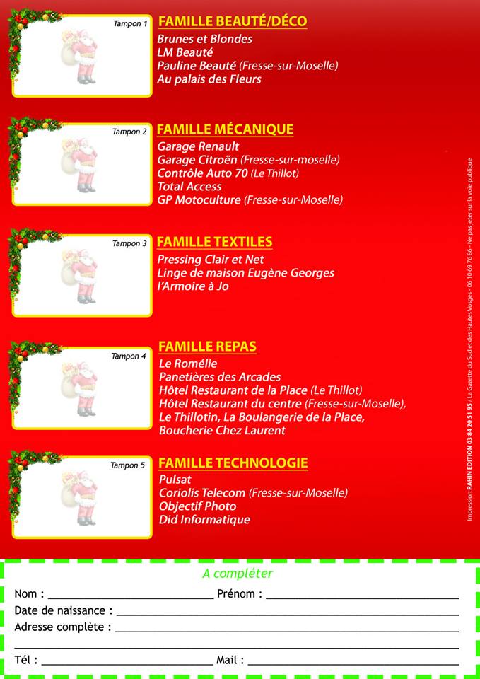 Après le superbe succès remporté par la première édition mise en place l’an dernier, l’UCAT propose une nouvelle fois son « Grand Jeu des 5 familles du Père Noël ». Une déclinaison sans carte du célèbre jeu des 7 familles, mais avec un bulletin de participation que chacun est amené à faire tamponner dans les commerces participants. Ce bulletin est disponible chez les commerçants participants. Il est également téléchargeable en cliquant ici. Trois mille Euros répartis en 50 cadeaux seront distribués, dont une tablette tactile 10 pouces, un week-end détente, un vélo enfants et 6 mois de baguette de pain (à raison d’une par jour). Concrètement, il est donc nécessaire de faire tamponner les 5 cases du bulletin de participation en passant dans les commerces participants, puis le déposer dans l’urne qui est installée à l’accueil d’Intermarché au plus tard pour le lundi 24 décembre à 12h00. Le tirage au sort sera effectué le jeudi 27 décembre à 19h, à l’Hôtel Restaurant de la Place, (« Chez Léon »).