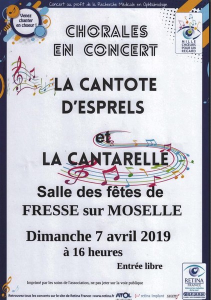 La Cantarelle, sensible à ce type d’opérations, ne pouvait pas rester insensible. Elle s’est donc associée à la Cantote d’Esprels, une chorale originaire de cette commune de Haute Saône, située non loin de Villersexel. Les deux ensembles seront donc réunis le dimanche 7 avril prochain à la salle des fêtes de Fresse sur Moselle, pour un concert commun dont le coup d’envoi sera donné à 16h. L’entrée sera libre et chacun pourra abonder à son gré dans une petite corbeille dont l’intégralité sera versée au profit de l’association RETINA FRANCE. Une nouvelle occasion de joindre l’utile à l’agréable…