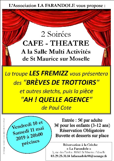 La pièce « Ah ! Quelle agence » de Paul Cote permettra au public de mettre à mal les zygomatiques au travers de situations mettant en scènes des personnages hauts en couleurs dans une comédie débridée, burlesque, rythmée, parsemée des quiproquos, de personnages tout aussi caricaturaux que sympathiques.