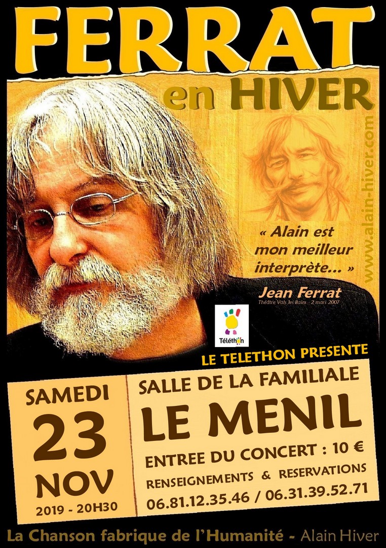 A noter encore que la musique sera présente lors de cette édition, tout comme elle devait l’être, entre autres animations, à l’occasion des nombreux rendez-vous programmés lors de ce Téléthon 2019, notamment ce concert « Hommage à Jean Ferrat » qui se tiendra le samedi 23 novembre à 20h30 à la Familiale du Ménil (voir affiche). Pour toutes les autres animations, un point sera fait à l’occasion d’une prochaine réunion mise au calendrier le jeudi 7 novembre à 20h00 à la salle Thiébaut de Ramonchamp.
