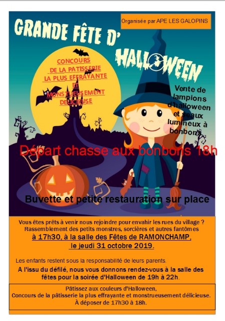 A Ramonchamp, ce sont les membres de l’association de parents d’élèves « les Galopins » qui appellent les monstres de toutes sortes à se réunir à la salle des fêtes à partir de 17h30. Au programme, l’envahissement des rues du village pour la chasse aux bonbons à partir de 18h avec, au retour, une soirée nécessairement endiablée qui se poursuivra jusque 22 heures. Il est également question d’un concours de la pâtisserie la plus effrayante et monstrueusement délicieuse à déposer à la salle des fêtes entre 17h30 et 18h.