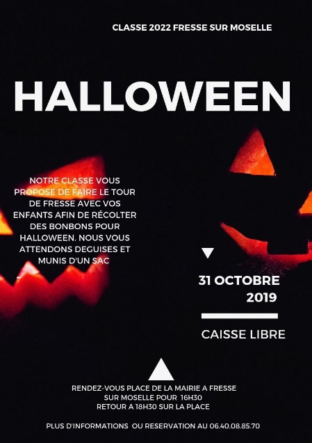 A Fresse sur Moselle, c’est à l’appel de la Classe 2022 que les jeunes monstres sont appelés à se rassembler à 16h30 place de la mairie pour la mise en place de l’épouvantable cortège muni de sacs afin de recueillir le fruit des offrandes que les habitants de la cité ne manqueront pas de leur donner. La fin de cette monstrueuse tournée est programmée à 18h30.