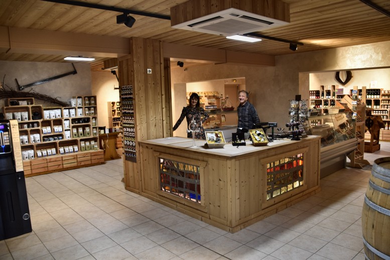 Dans quatre jours donc, c’est une surface de cent-trente mètres-carré qui va ouvrir ses portes aux amateurs de bonne chère, avec un large panel de produits présentés dans un cocon tout simplement magnifique. Un cadre fortement marqué par la pierre et le bois tout frais découpé et dont les agréables senteurs sont encore présentes pour un moment dans la nouvelle boutique. Le tout agrémenté de pièces de musée comme cette scie passe-partout ou encore cette superbe vanneuse magnifiquement restaurée. Le comptoir n’est pas en reste avec une somptueuse mosaïque d’émaux de Longwy superbement mis en valeur par un éclairage intérieur.