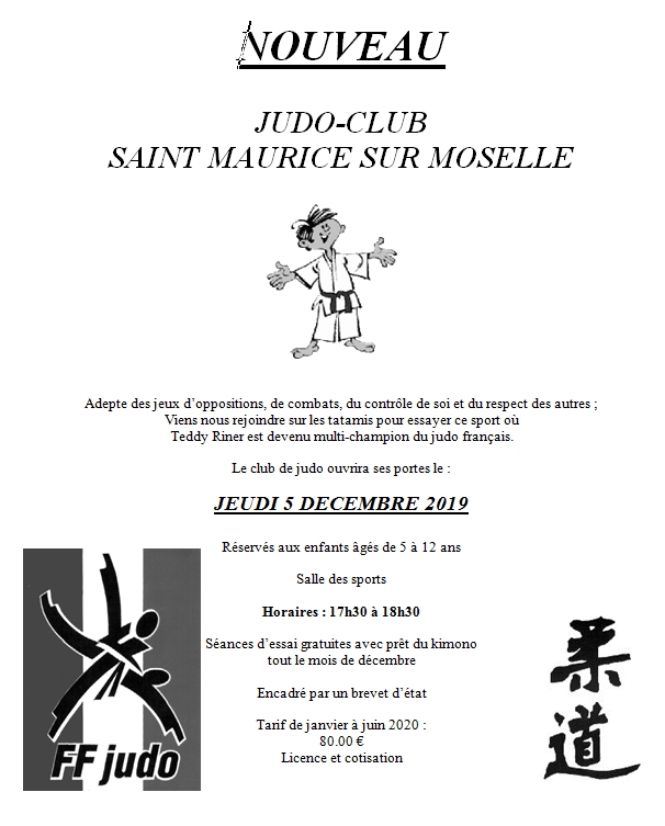Du coup, les communes de St Maurice et Bussang ont été sollicitées afin de mettre en œuvre des séances pour les enfants. »Nous avons été très ben reçu et notre proposition les a tout à fait séduit » confie l’enseignant. C’est ainsi que dès ce lundi 2 décembre de 17h30 à 18h30, les enfants âgés de 5 à 12 ans de Bussang pourront découvrir le judo, au travers d’activités ludiques, à la salle des fêtes où seront installés les indispensables tapis. Durant tout le mois de décembre, ils pourront marcher sur les traces de Teddy Riner gratuitement, le club allant même jusqu’à mettre les kimonos à disposition.