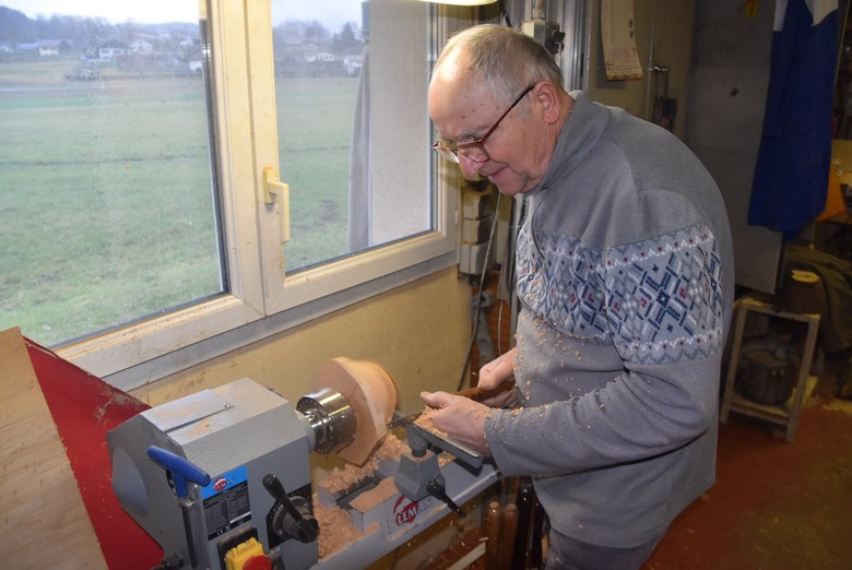 Dans l’atelier qu’il s’est construit à proximité de sa maison de Remanvillers, et dans lequel règne une douce chaleur en provenance d’un poêle à l’ancienne, Gilbert Galmiche aime caresser le bois - les bois pourrait-on même dire, entre ces chutes qu’il ramasse en forêt et ces morceaux qu’on lui donne, lui offrant un large panel d’essences différentes – avec ses outils. Combiné, scies à ruban, tour… l’atelier est riche de ces outils nécessaires au menuisier, une activité que Gilbert décline à la façon des sculpteurs, des artsites même..