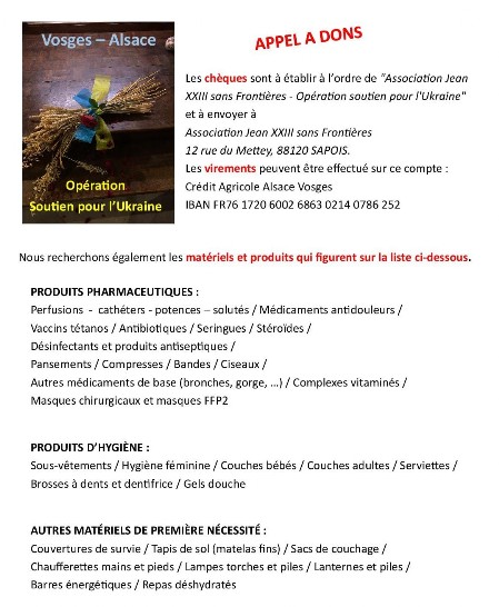C’est ainsi qu’un groupe s’est créé « Vosges Alsace soutien Ukraine » sous la houlette de l'Association Jean XXIII sans frontières, intégrant les paroisses de la Haute Moselle et de la Moselotte.