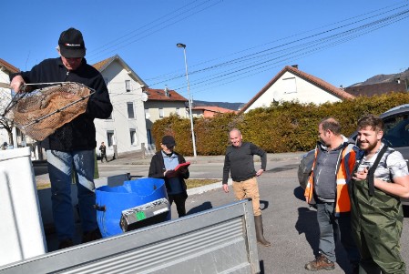 Sur le parking de la médiathèque, côté rue de la Mouline, où était sonné le rassemblement, ils se sont réparti les tâches pour mettre à la rivière 140kg de truites fario.