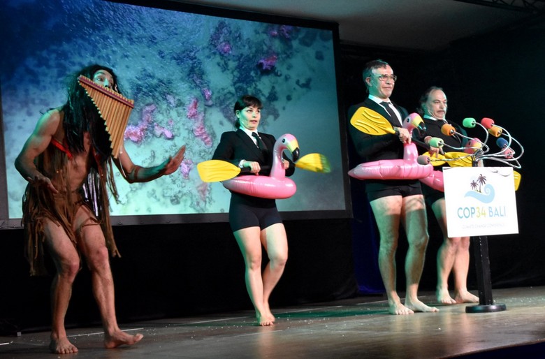 Mêlant un jeu d’acteur de haut niveau, musique et chant, chorégraphies souvent déjantées, le tout accompagné d’effets de scène, notamment fumée et lumières ainsi que projection de diapos et vidéos sur écran géant installé en fond de scène, les comédiens ont déroulé les grandes lignes de la situation actuelle : la fonte de la banquise, la forêt amazonienne qui brûle, ce qu’on appelle le 7ème continent dans la Pacifique formé par des plastiques rassemblés par les courants marins, ces COP, ces « Conference of parties » où les chefs d’Etats tentent de faire bonne figure face aux rapports pourtant clairs et alarmants du GIEC (Groupe d'experts intergouvernemental sur l'évolution du climat), mais qui, finalement ne font pas avancer grand-chose.