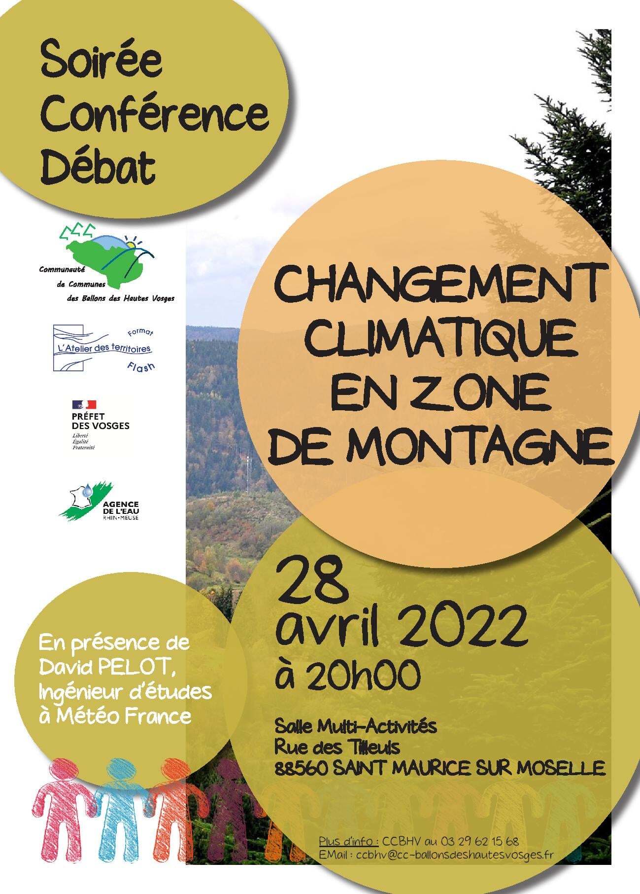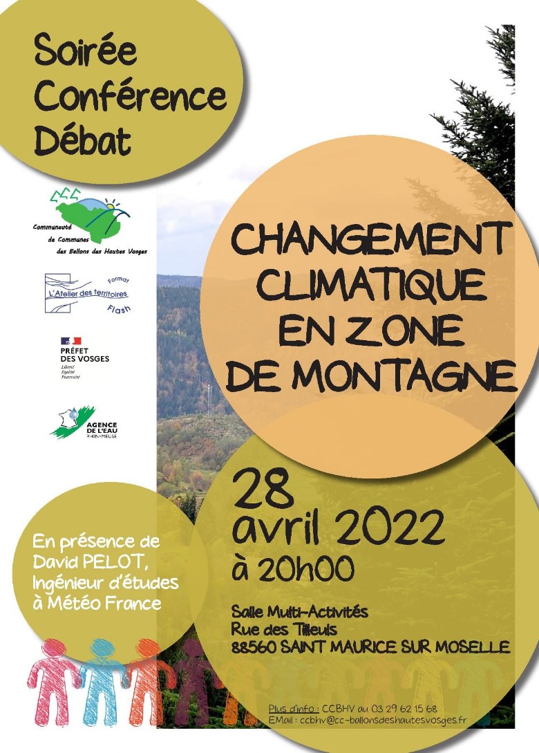Le grand public n’a pas été oublié, puisqu’il pourra participer à une conférence-débat « Changement climatique en zone de montagne », organisée le 28 avril, à 20h00, à Saint-Maurice-sur-Moselle (Salle multi-activités) en présence de M. David PELOT, Ingénieur d’études à Météo France.