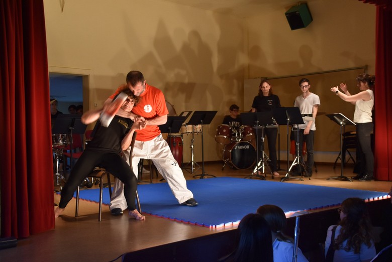 De nombreuses et spectaculaires démonstrations ont parsemé cette soirée, sur un tatami à la taille particulièrement réduite afin de s’adapter aux dimensions de la scène. Le tout entrecoupé ou accompagné par les sonorités très orientales des flûtes de l’ensemble de l’école de musique des harmonies du Thillot et Bussang-St Maurice, ou les percussions résonnant avec force, illustrant parfaitement les combats.