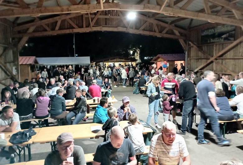 "La halle de la Mouline était noire de monde de 19 heures jusque tard dans la nuit. Les succulents poulets en crapaudine, cuits par les chefs barbecue d'un soir, ont été servis par la jeune génération de joueurs de football. Les saucisses se sont également vendues comme des petits pains. Un système de précommande a même dû être mis en place pour la vente des crêpes sucrées « le Monsieur à la casquette 21hrs, la Dame en robe fleurie 21hrs10... ». Beaucoup de touristes sont venus renforcer le nombre des Bussenet(te)s présent(e)s. Il a été également aperçu de nombreux représentants d'associations, de commerçants du village, la direction du Théâtre du peuple et du Sunélia, des membres du Conseil municipal ….Seule l'allumage de la chavande, surmontée d'un très joli chalet fleuri, a vidé la halle pour un temps seulement. Nous souhaitons un succès identique aux trois autres manifestations organisées à Bussang en juillet, le 14 par la Société des fêtes et les vendredis, 22 pour la « sardinade » du Comité de jumelage et 29 pour le « repas campagnard » de l'amicale des pompiers."