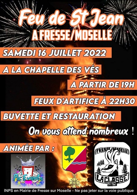 Un peu moins haut, mais tout de même bien installée sur les hauteurs de la montagne vosgienne, la chavande montée par les conscrits de la Classe 2024 à proximité de la Chapelle des Vés à Fresse sur Moselle sera également mise à feu ce samedi. Une soirée de fête, proposant buvette et restauration rapide, qui sera animée par « Pic Events » et qui permettra de plus le tir des feux d’artifice sur les coups de 22h30.