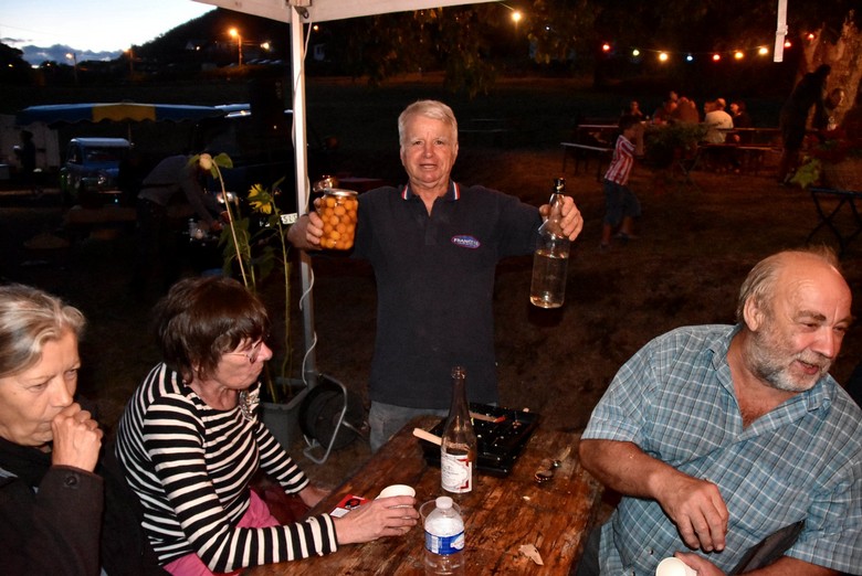 Une bouteille de gnole de mirabelle tout aussi délicieusement parfumée que rude à avaler et un bocal de mirabelles bien rondes baignant dans l’alcool depuis de nombreux mois, et procéder à une joyeuse tournée générale dans de grands éclats de rire.