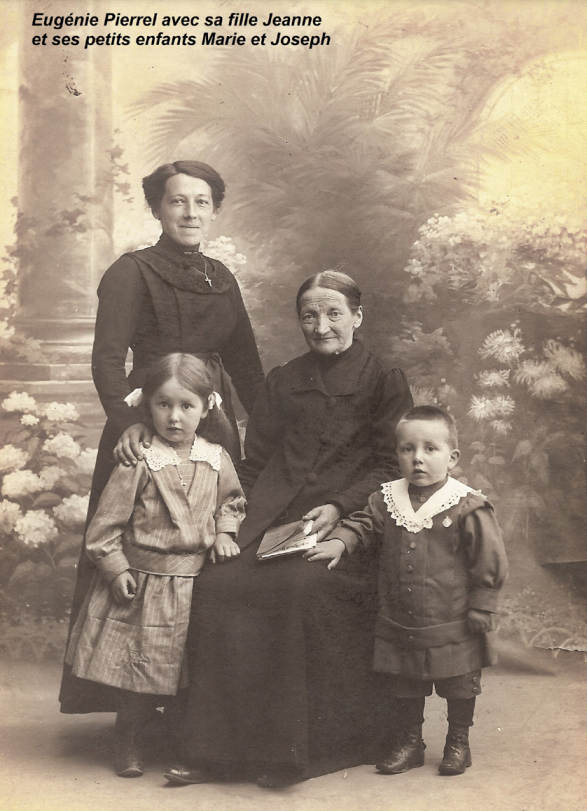 En ce début de XX° siècle la structure de la famille d’Eugénie évolue naturellement. Amélie se mariera en 1906, Jeanne en 1912. Leurs maris respectifs connaîtront la guerre 14/18 mais auront la chance de revenir du front. Eugénie aidera ses filles à s’organiser dans leurs quotidiens sans homme à la maison pendant la Grande Guerre.Lorsque sa fille Marie s’est retrouvée enceinte un peu avant l’armistice, elle l’a dissuadée d’accepter la demande en mariage que le père du futur bébé lui a faite