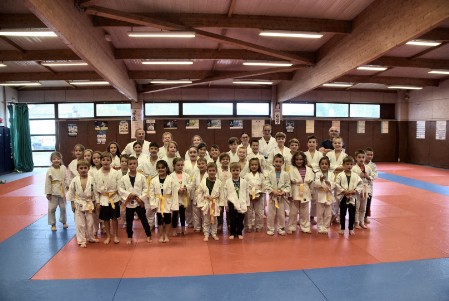 judokas, tous revêtus d’un kimono, mis à disposition par le club pour les