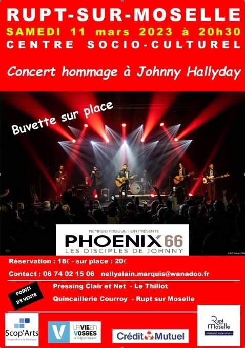 Initialement prévu l’an dernier, le concert hommage à Johnny Halliday aura bien lieu. L’équipe de la Scop’Art l’avait promis : promesse tenue donc. Ce sera le samedi 11 mars à 20h30 au centre socio culturel. Les nombreux admirateurs de l’idole disparue mais toujours présente dans le cœur de ses fans inconditionnels pourront se délecter sans modération du spectacle « Voyage au pays des vivants » rassemblant 27 titres de l’immense répertoire de Johnny qui les fera fredonner durant plus de deux heures. Une soirée qui s’annonce riche en émotions pour rendre un bel hommage à ce grand artiste via l’excellent groupe « Phoenix 66 »