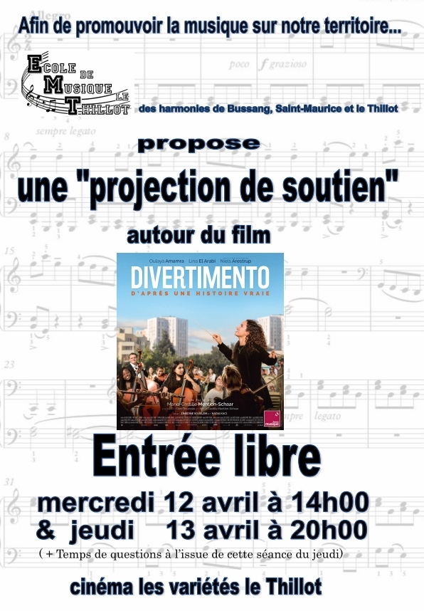 Il nous reste très peu de temps pour vous convaincre du bien-fondé de notre démarche, et c'est pourquoi nous organisons des projections du film Divertimento, film récent qui par une coïncidence magnifique montre ce que peut être un projet proposant la musique au plus grand nombre. Le succès de ces projections sera la mesure de l'attachement de la population à l'existence de notre association culturelle.
