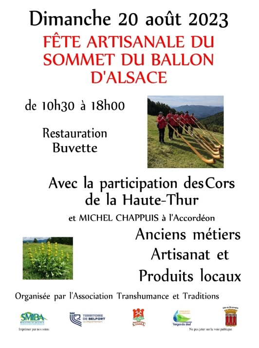 La Fête artisanale du Ballon initiée par Transhumance et Traditions de Giromagny se déroulera le dimanche 20 août au Col du Ballon, à la limite des départements 88 et 90, dans l’espace des Démineurs. C'est sur cette haute terre que se situent comme chaque année, depuis 1998, ces rencontres uniques entre un public nombreux, curieux, régional, et estivants et les exposants multiples, parmi lesquels certains n’hésitent pas à prendre l’outil pour des démonstrations spectaculaires.