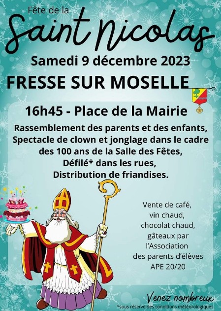 Le second rendez-vous de ce 9 décembre est fixé à partir de 16h45 place de la Mairie à Fresse sur Moselle où, si les conditions météorologiques le permettent, il défilera dans les rues de la cité avec les enfants et leurs parents au terme d’un spectacle clown et jonglage programmé dans le cadre du centenaire de cette salle qui porte fort justement le nom des nombreuses fêtes qui s’y déroulent. L’association de Parents d’Elèves 20/20 y tiendra un stand de vin chaud, chocolat et gâteaux.