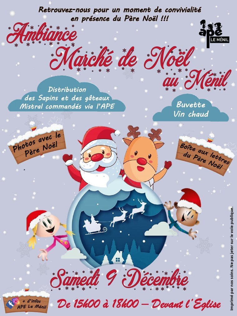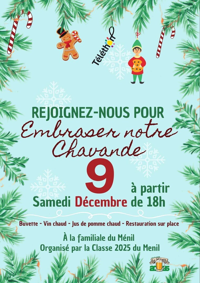 Le samedi 9 décembre, sous l’égide de l’association de parents d’élèves, le public sera invité aux abords de l’église du Ménil pour une « Ambiance Marché de Noël » de 15h à 18h, avec la présence du Père Noël au stand de vin chaud. Dans la foulée, le public pourra rejoindre la Familiale où la Classe 2025 pourra enfin embraser sa chavande au cours d’une fête où, là encore, un stand restauration rapide et buvette sera à disposition.