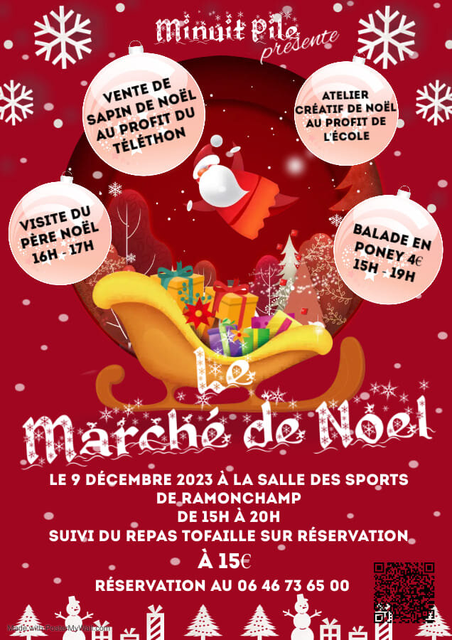 Ce même 9 décembre, la salle de sports de Ramonchamp accueillera le Marché de Noël de Minuit Pile, qui sera suivi d’un repas toffailles à réserver au 06 46 73 65 00. Une manifestation qui recevra, elle aussi, la visite du Père Noël qui a annoncé son arrivée vers 16h. Il y sera également question d’un atelier créatif au profit de l’école, de vente de sapins de Noël au profit du Téléthon et de balades en poney de 15h à 19h.