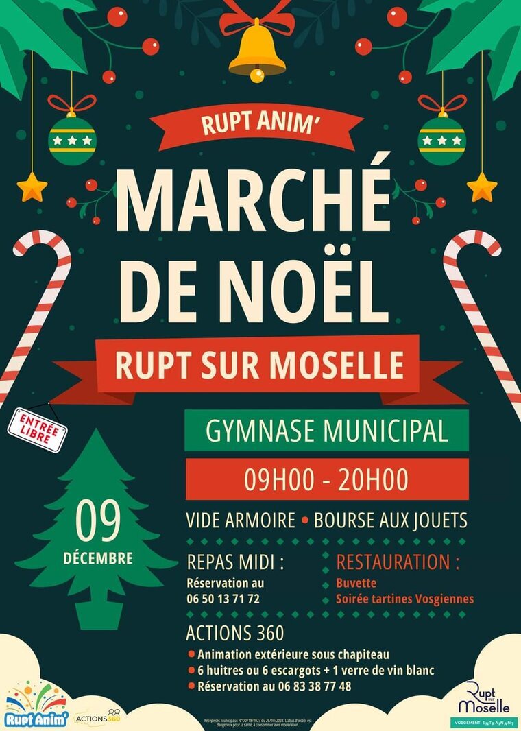 La commune de Rupt sur Moselle ne sera pas en reste avec, également le 9 décembre, le Marché de Noël proposé par Rupt’Anim au gymnase municipal, qui sera associé à un vide-armoire et une bourse aux jouets, tandis que les commerçants « Actions 360 » installeront un chapiteau à l’entrée de la salle pour proposer huitres et/ou escargots (réservations au 06 83 38 77 48). Un repas sera servi à midi sur réservation au 06 50 13 71 72 et, en fin de journée, une soirée tartines vosgiennes.