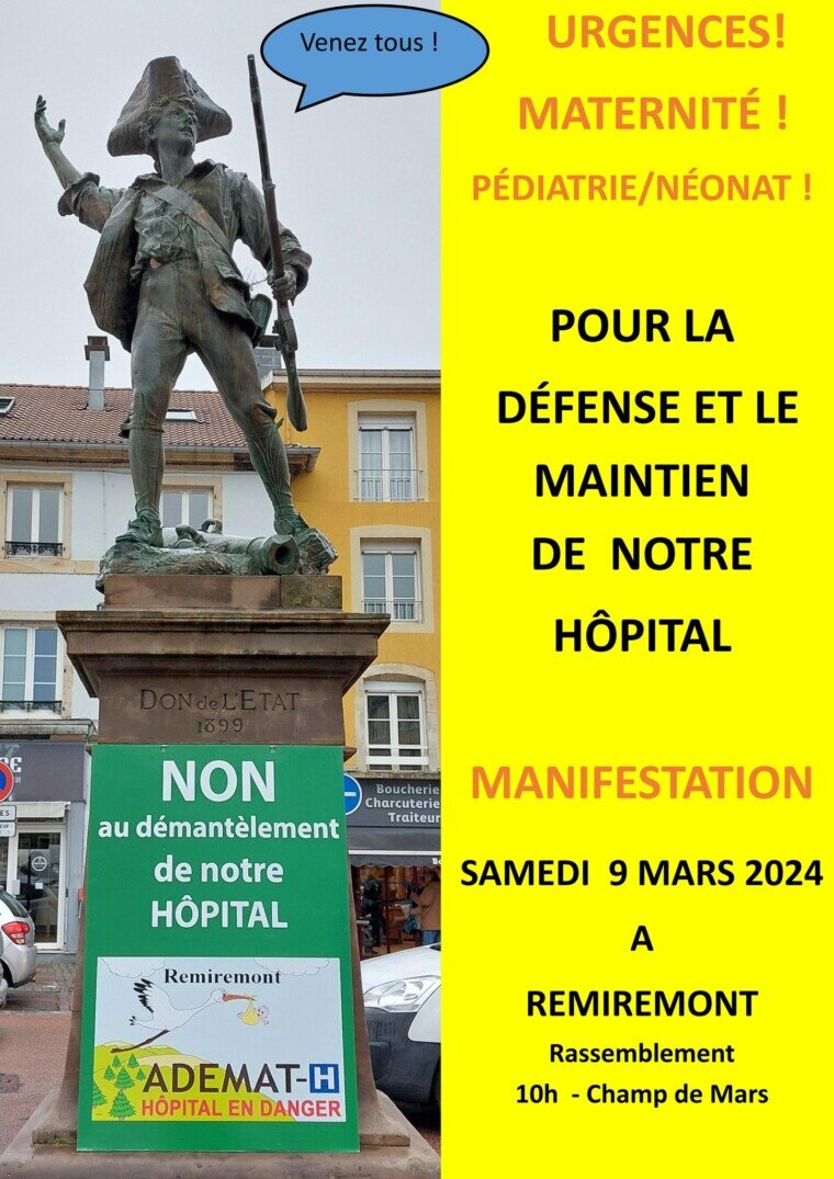 Face à cette situation, l’ADEMAT-H appelle une nouvelle fois population et élus à manifester le samedi 9 mars prochain. « Nous appelons à réagir encore et a ne pas subir le démantèlement de notre hôpital et de la maternité a nouveau menacée » précisent les militants de l’ADEMAT-H « Nous appelons le ministre de la Santé, la direction de l'Agence Régionale de Santé et les directions des hôpitaux des Vosges et du CHRU à prendre leurs responsabilités pour que notre territoire de plus de100 000 habitants ne soit pas sacrifié.