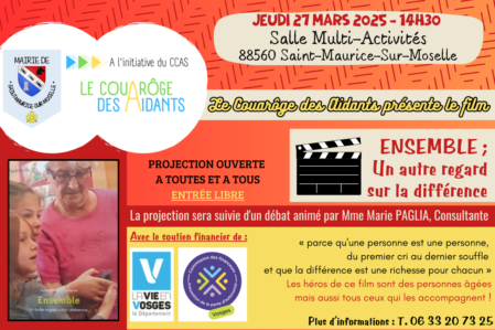 Dans le cadre du Couarôge des Aidants initié par Marie-Paule Barb, le CCAS (Centre Communal d'Action Sociale) de Saint-Maurice-sur-Moselle, soutenu financièrement par le Conseil Départemental des Vosges et la Conférence des Financeurs, met en place sur l’année 2025 un groupe de parole destiné aux Aidants.