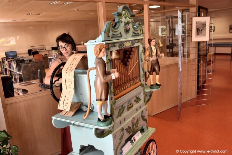 Ce sont de véritables trésors qui sont exposés jusqu’à la fin du mois à la médiathèque. Imaginez : un gramophone à pavillon venant des Etats-Unis et daté du début du XXème siècle, un ariston : une organette inventée à Leipzig en 1876, un gasparini : superbe orgue de foire datant des années 1910, cet incroyable livre musical ayant vu le jour en Allemagne en 1880, dont les sonorités reproduisent des cris d’animaux en tirant une petite cordelette actionnant un mini-soufflet en papier dont l’air provoque l’émission des sons, ou encore cette improbable chaise musicale (qui n’a rien à voir avec ce jeu très connu) qui émet de la musique lorsqu’on s’assied dessus.